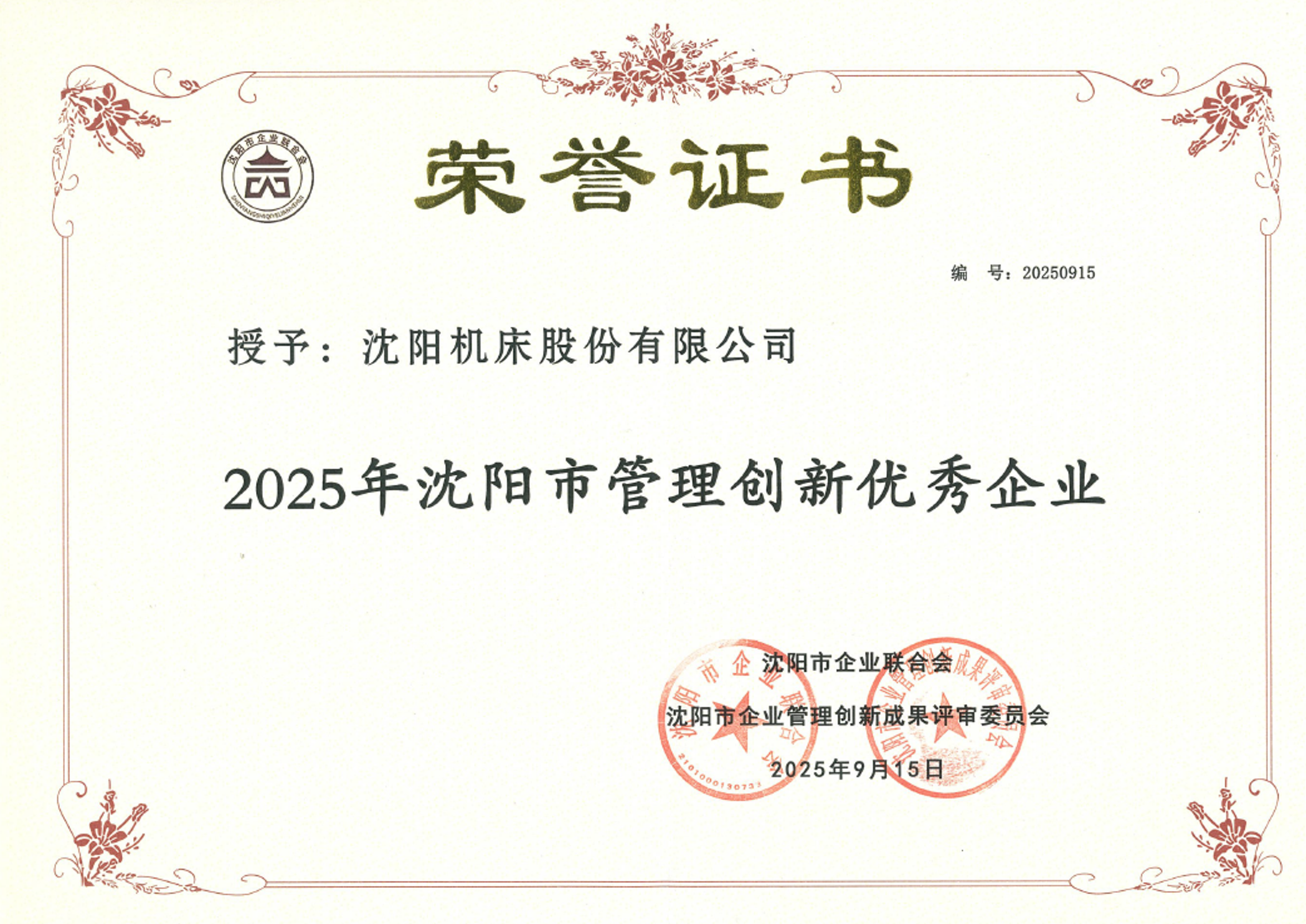 近日,通用技術(shù)沈陽機床獲評“2025年沈陽市管理創(chuàng)新優(yōu)秀企業(yè)”。